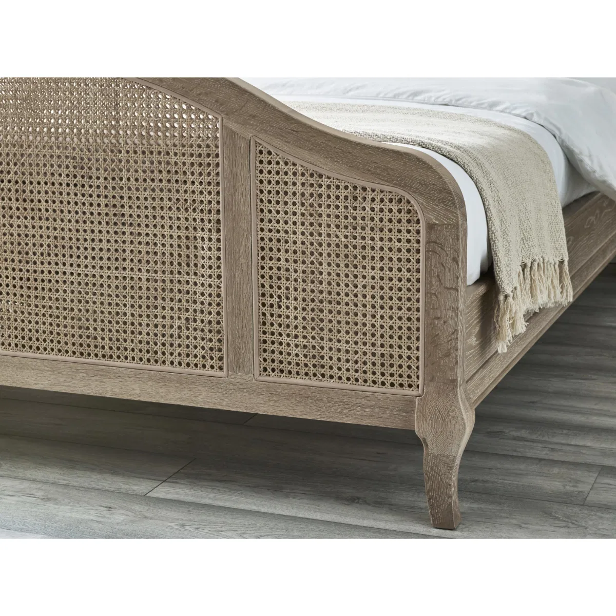 Introduce rustic elegance and classic charm to your bedroom with the Fleur Rattan Bed in Light Oak. This beautifully crafted bed features a graceful arched headboard and footboard with intricate rattan detailing, accented by beautiful white fine details that add a touch of sophistication. The light oak finish enhances the wood’s natural beauty, creating a warm, inviting atmosphere. With a solid wooden frame for durability and elegant cabriole legs for a French-inspired flair, this bed seamlessly blends traditional design with modern functionality. Simple assembly ensures you can quickly enjoy your stylish new centerpiece. Mattress sold separately.