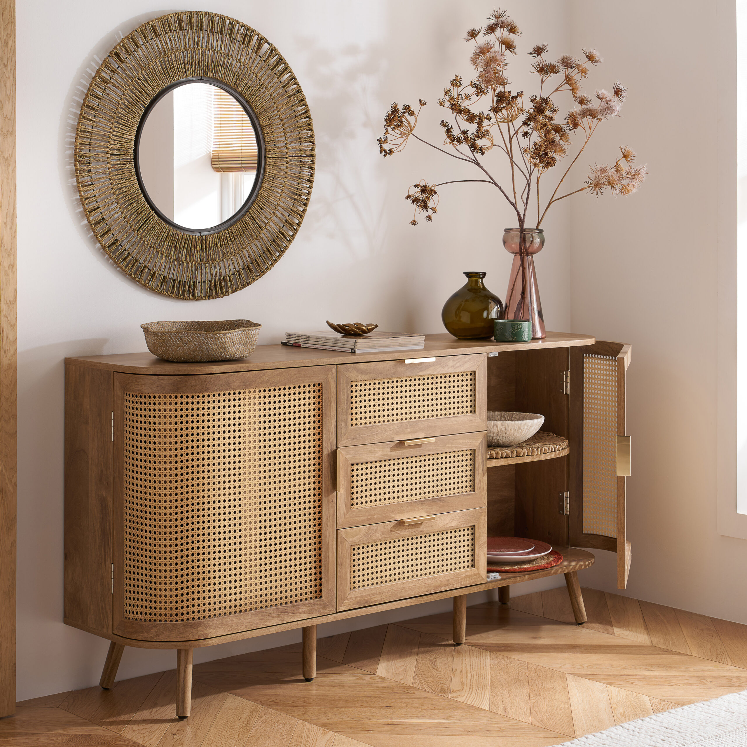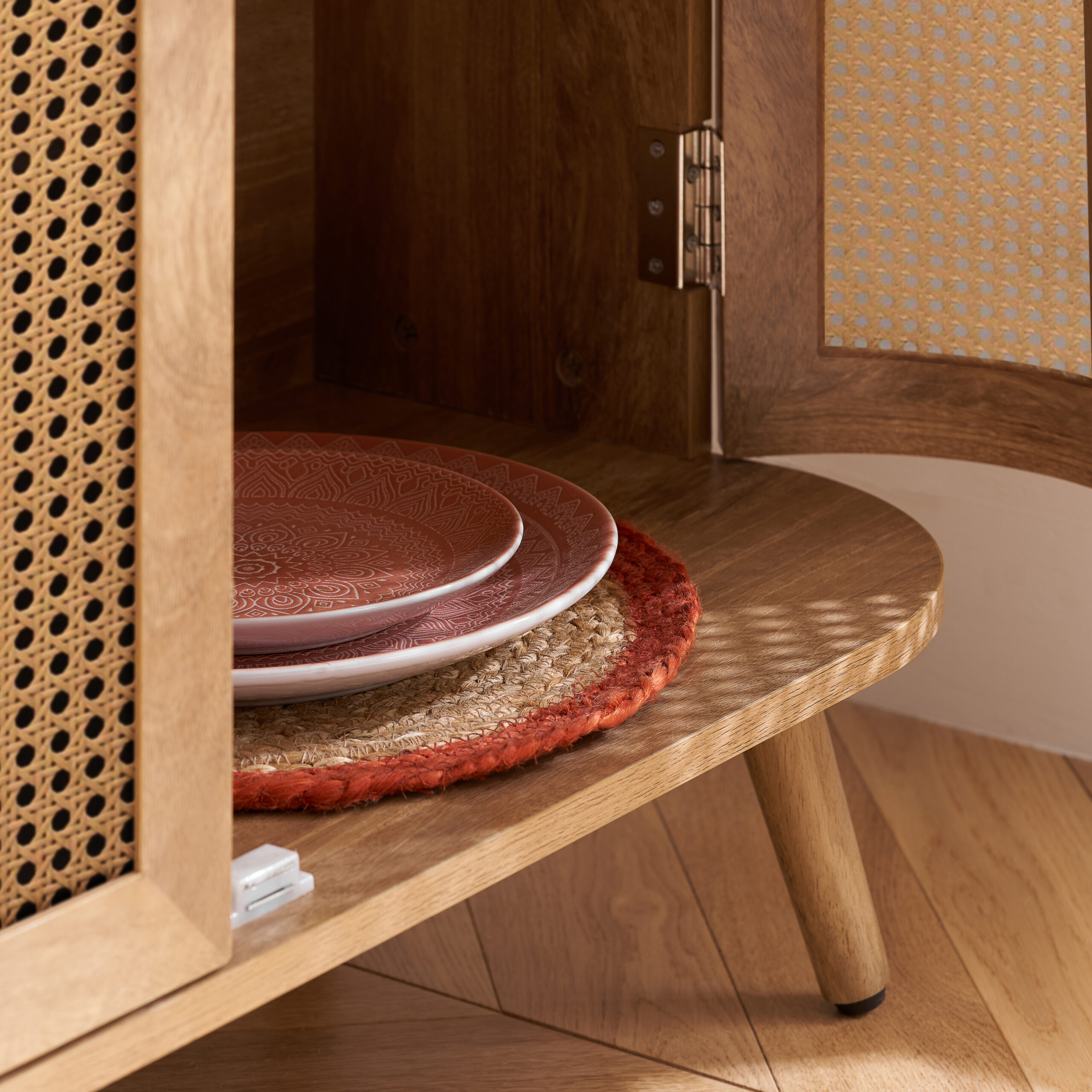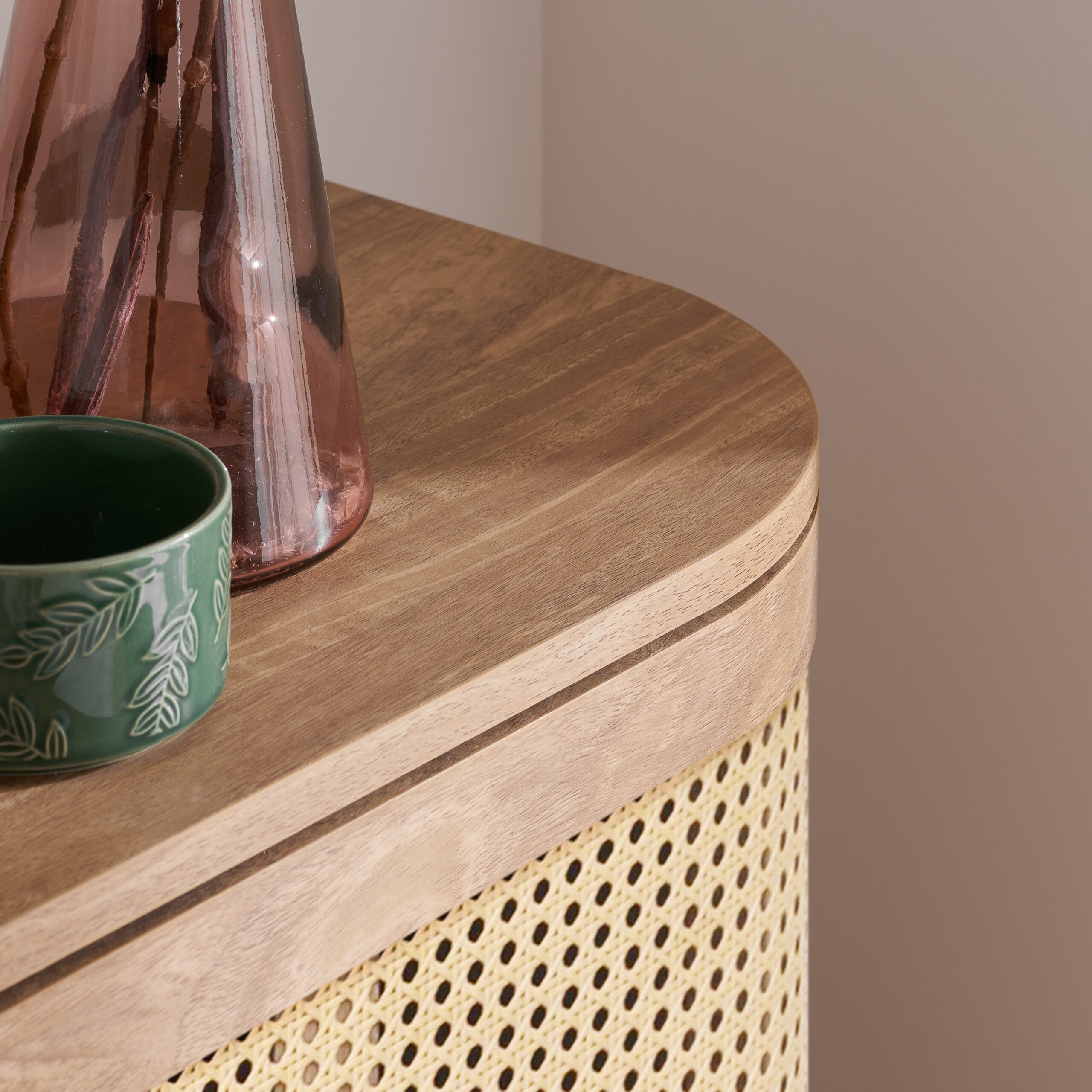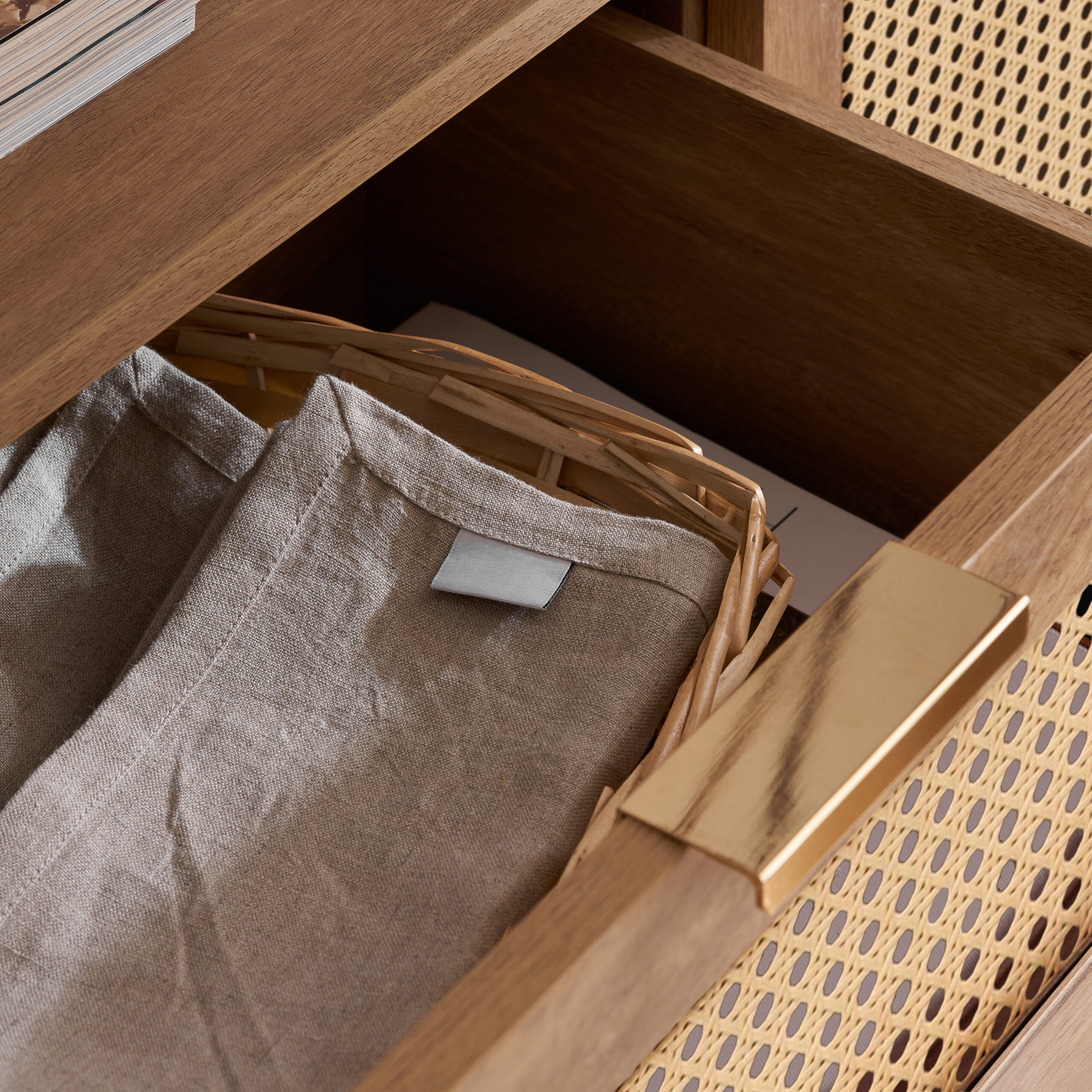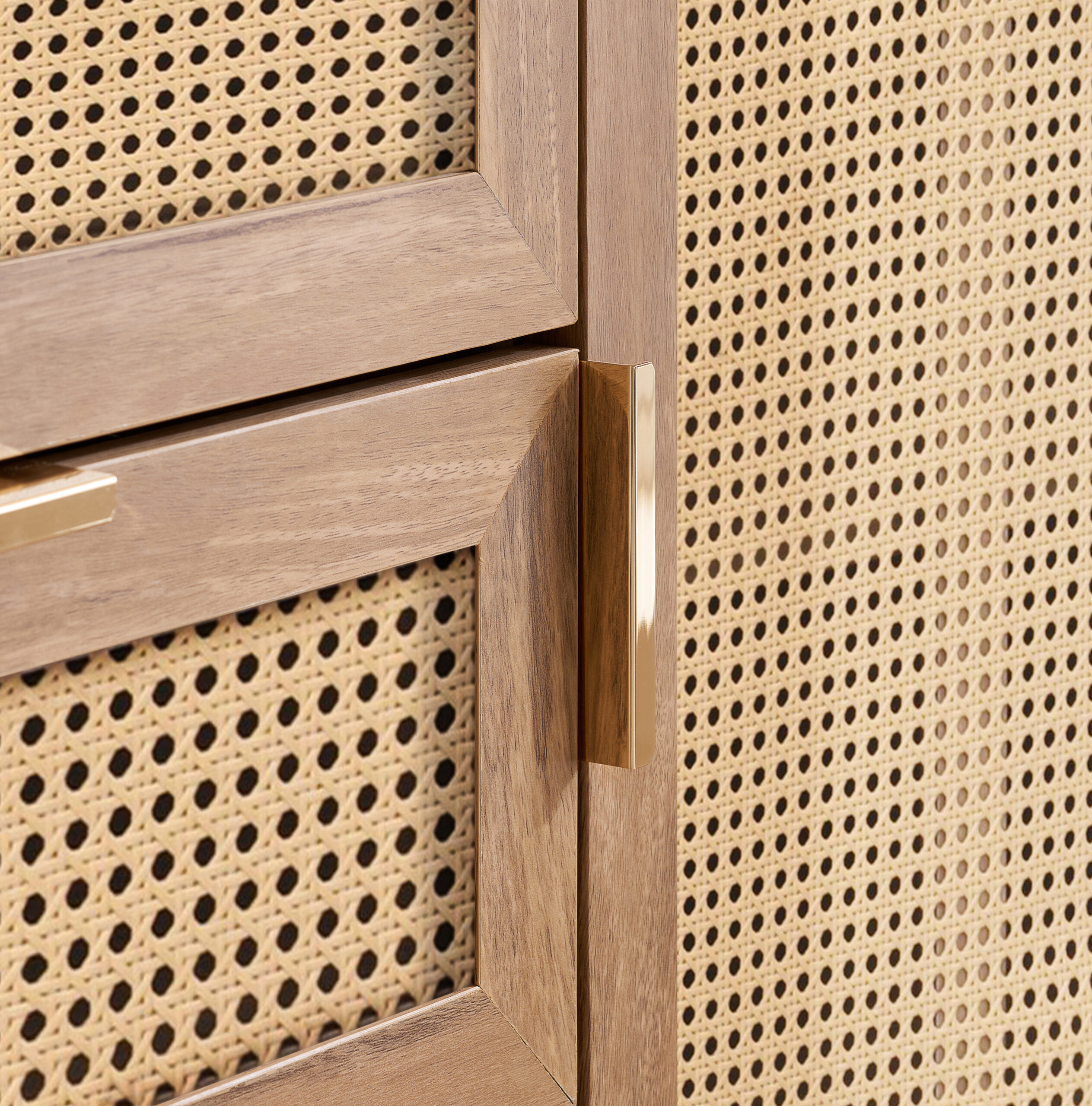 Each curve is thoughtfully softened, featuring delicate bevels that whisper a modern sensibility. The rattan front is meticulously woven, presenting a pattern that is both eye-catching and gracefully reserved. The warm, neutral palette ensures versatility, while the smooth wooden surfaces invite a tactile experience.