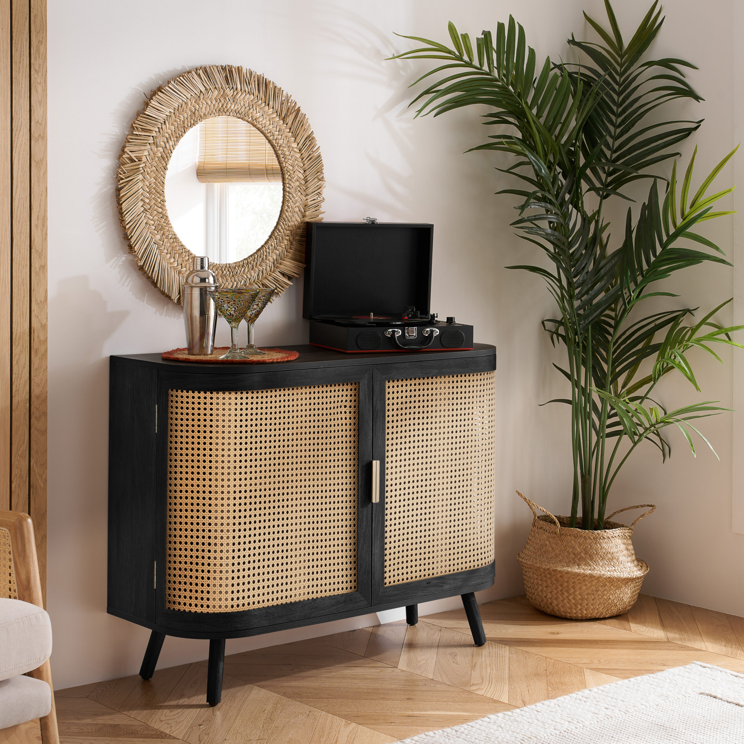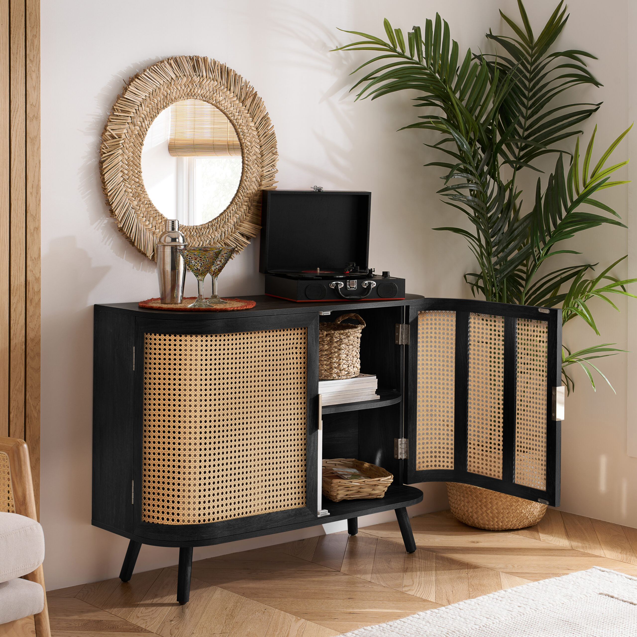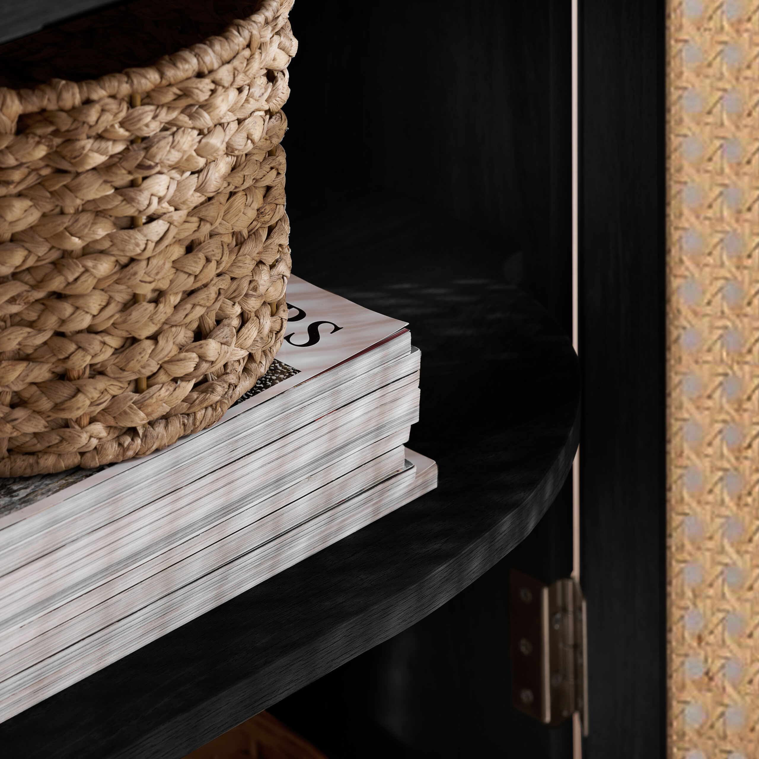 Each curve is thoughtfully softened, featuring delicate bevels that whisper a modern sensibility. The rattan front is meticulously woven, presenting a pattern that is both eye-catching and gracefully reserved. The warm, neutral palette ensures versatility, while the smooth wooden surfaces invite a tactile experience.