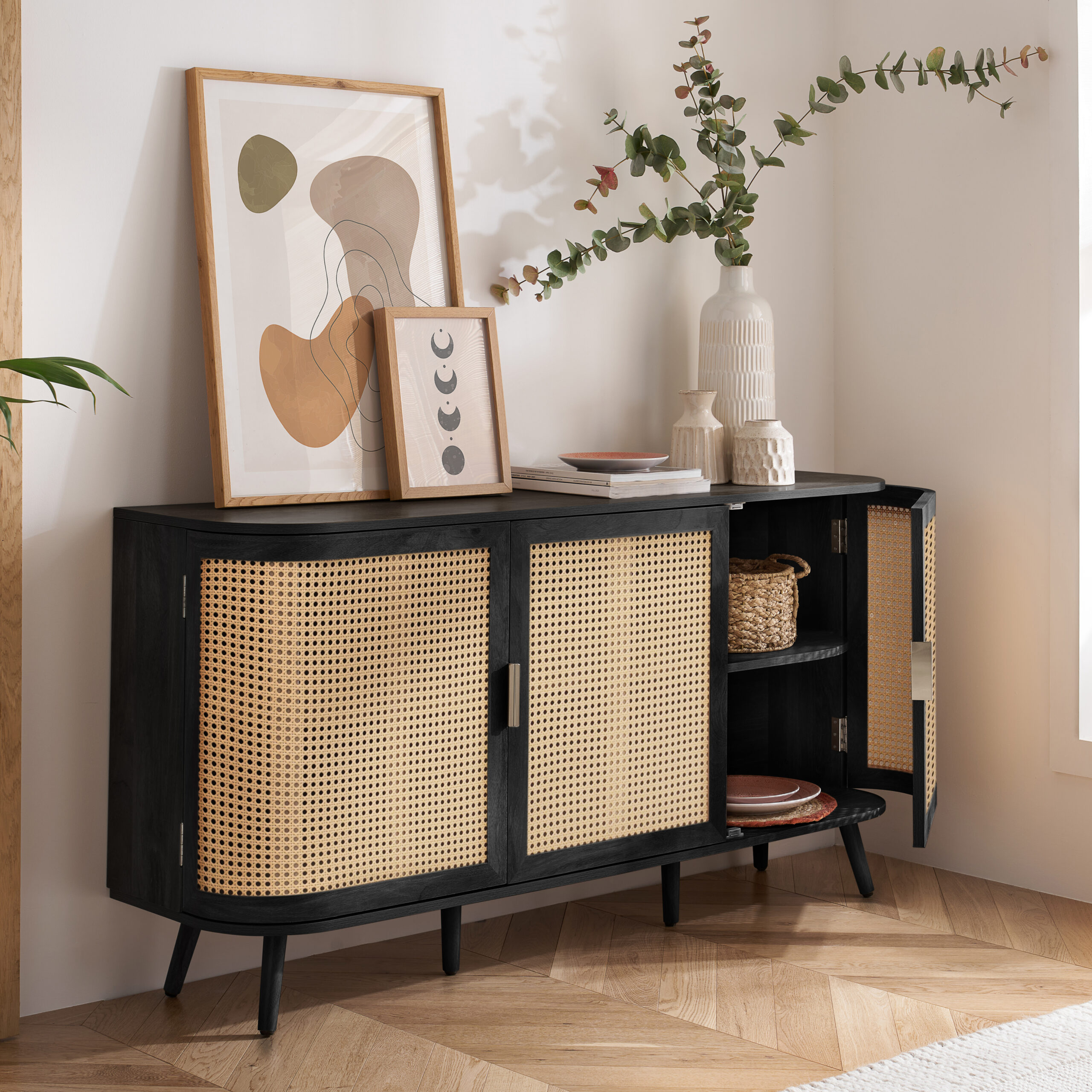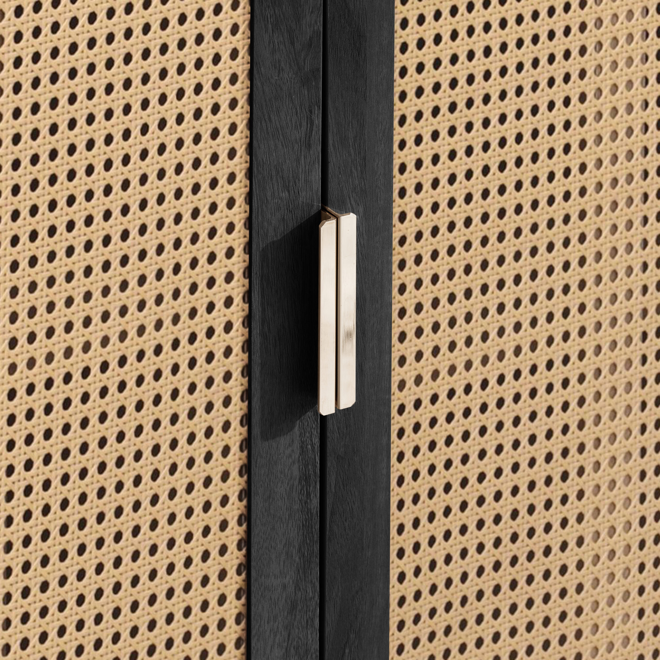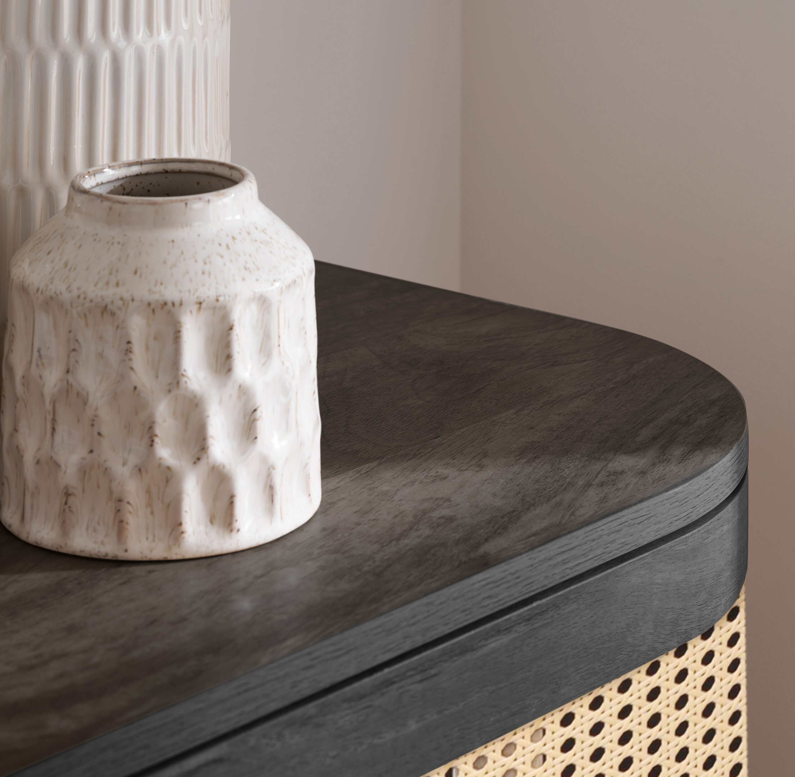 Each curve is thoughtfully softened, featuring delicate bevels that whisper a modern sensibility. The rattan front is meticulously woven, presenting a pattern that is both eye-catching and gracefully reserved. The warm, neutral palette ensures versatility, while the smooth wooden surfaces invite a tactile experience.