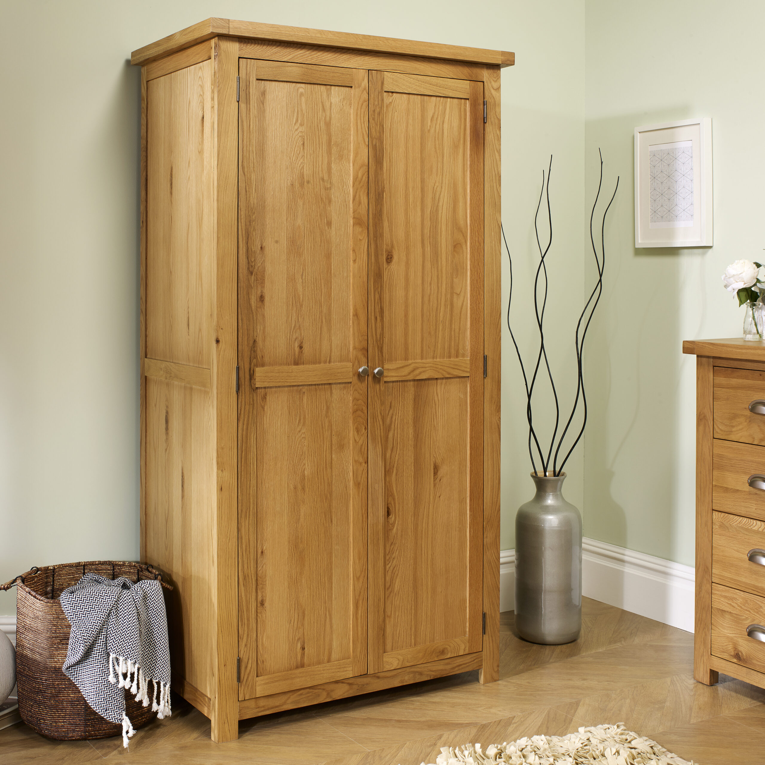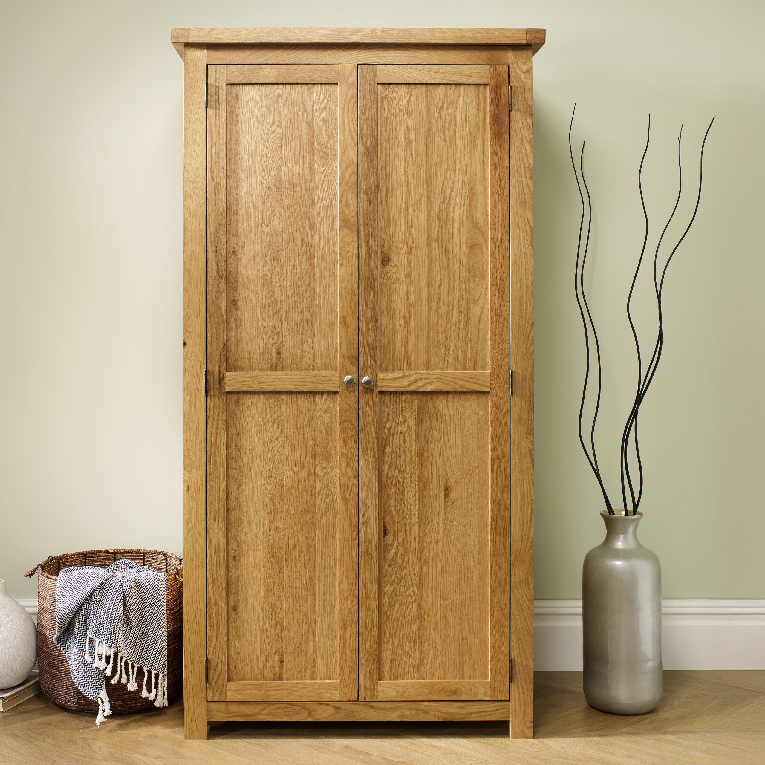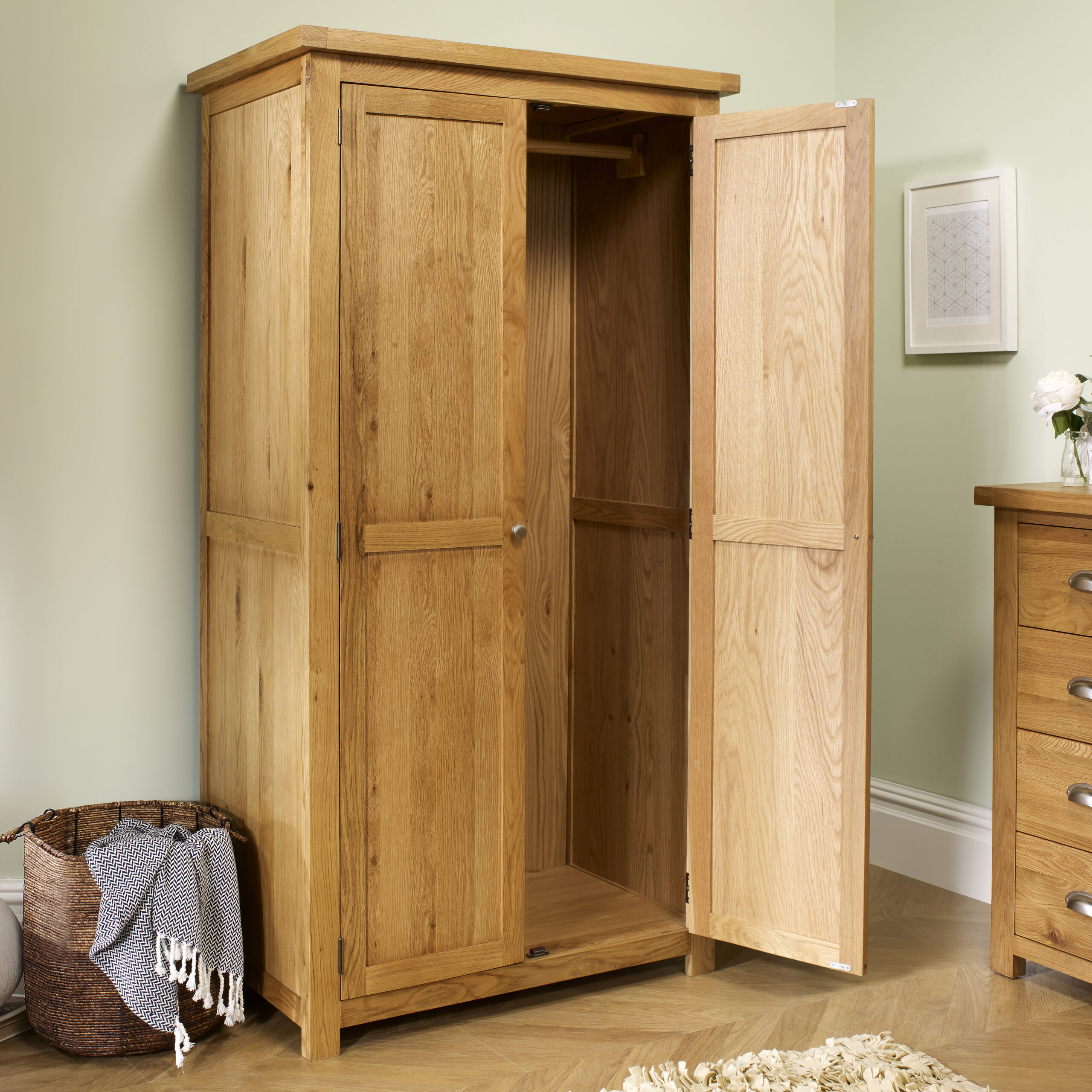 This 2-door wardrobe is spacious behind double doors, featuring a single rail, ideal for organising clothing.
